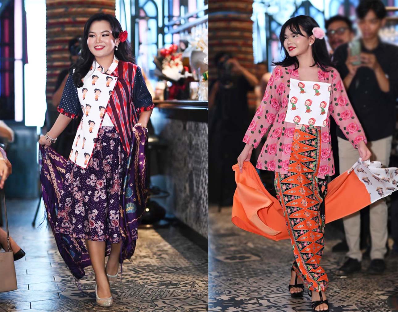 Tujuh kebaya yang ditampilkan mengusung gaya kutubaru dan kartinian dengan warna-warna cerah serta ilustrasi berani. Beberapa desain memadukan elemen modern di satu sisi dan tenun tradisional pink di sisi lain, menampilkan kekayaan budaya dalam satu frame.