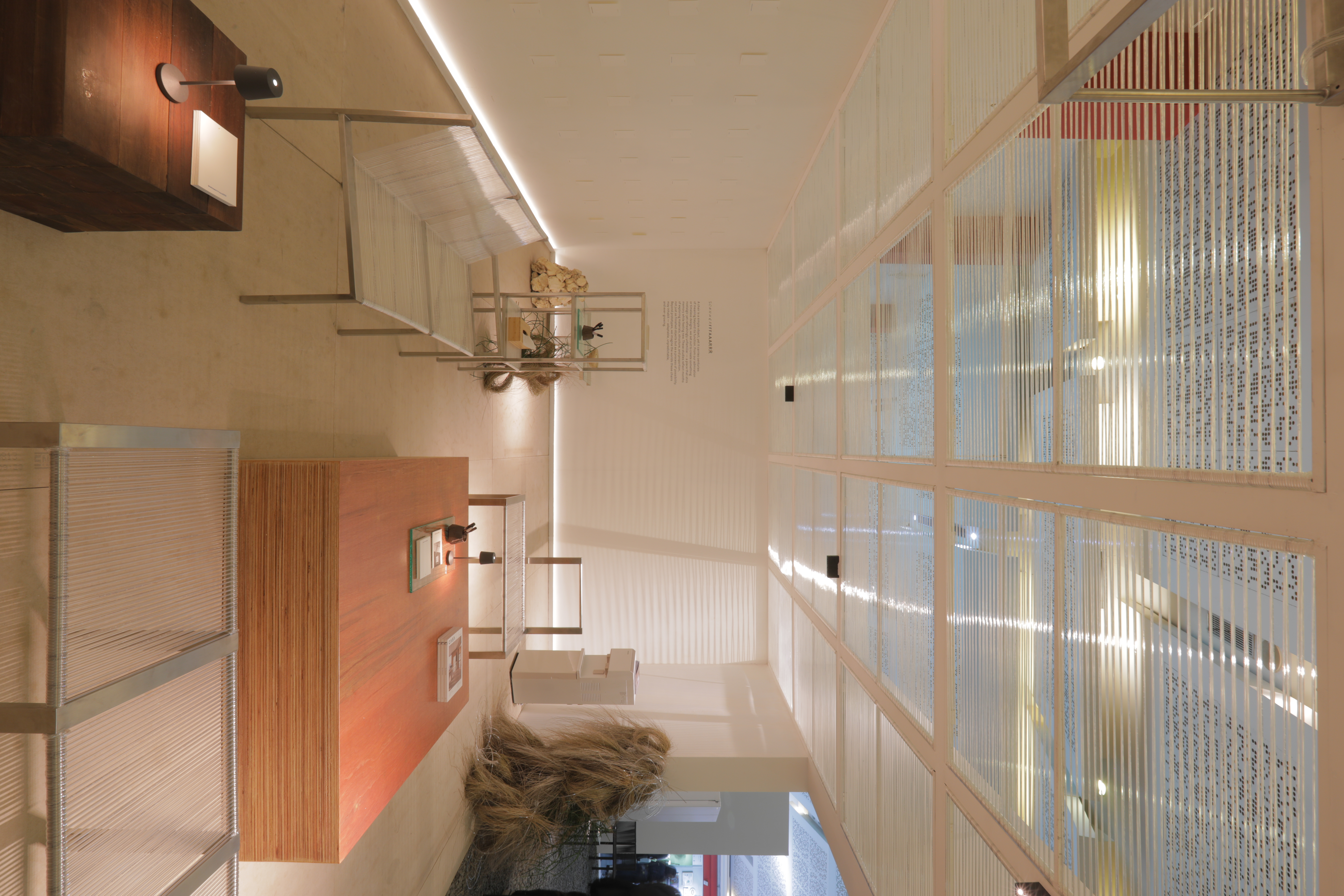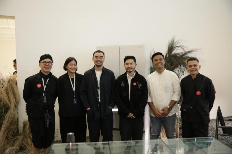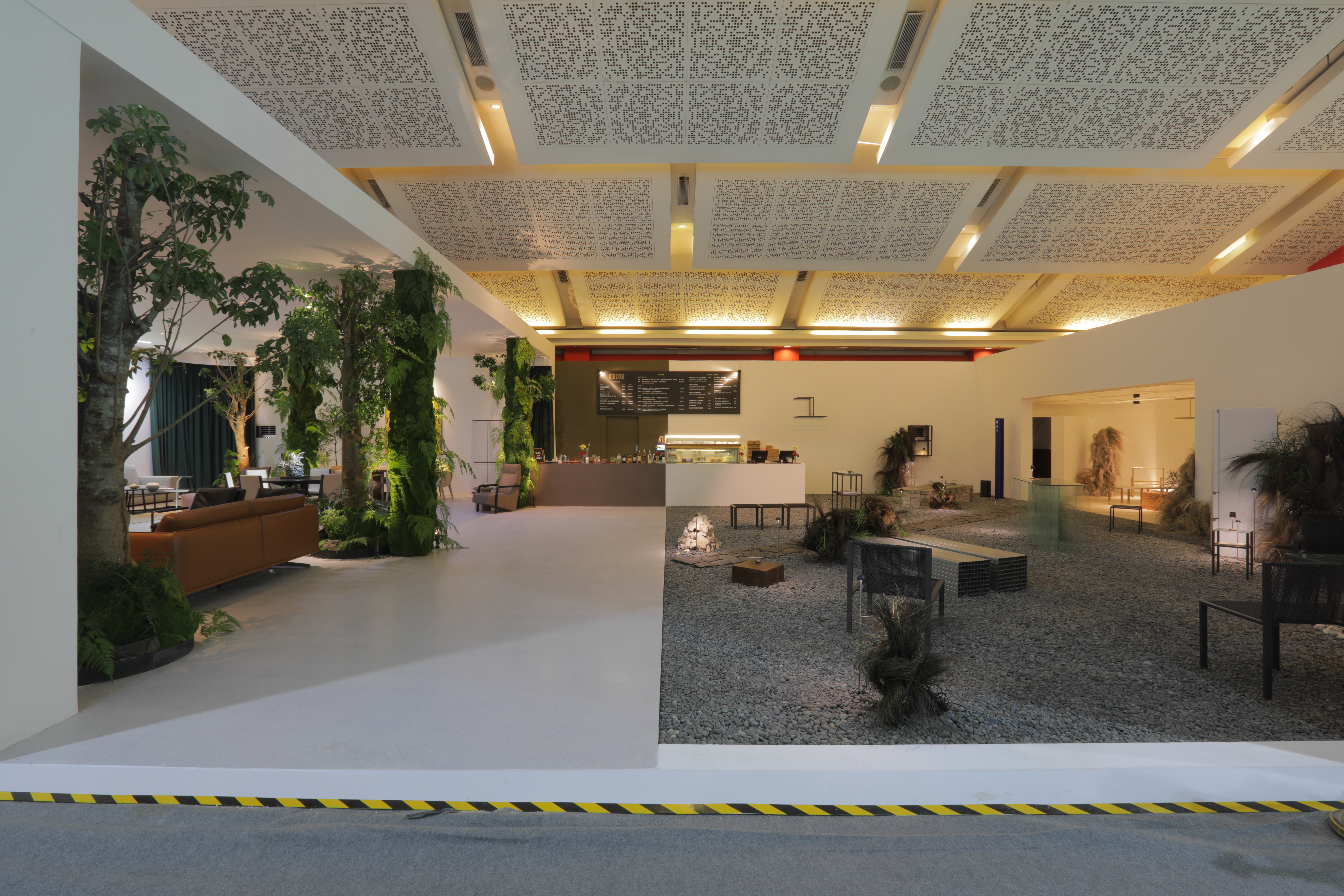 Marcello Decaran dari KIAT Architects menghadirkan transisi halus antara ruang dalam dan luar. Kehadiran tanaman hijau yang rimbun, kolom berlapis lumut, serta tirai menyerupai hutan menciptakan suasana taman hidup. Sebuah “matahari palsu” memandikan ruangan dengan cahaya siang, sementara karya dua nada dari Atreyu Moniaga menegaskan permainan antara alam dan artifisial. Dirancang bersama Melyna dari tim KIAT, Satya dari Larch Studio, Silikal, Laflo, Artisan Rugs, Idefab, dan Class International, lounge ini mengundang pengunjung untuk berhenti sejenak, merenung, dan berinteraksi.