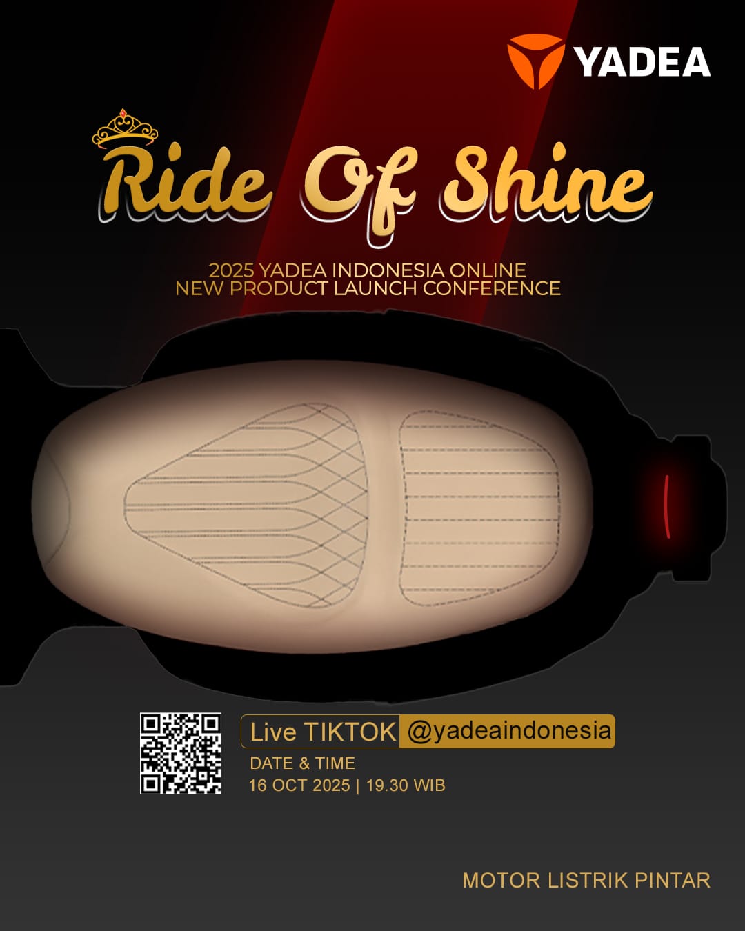 Lewat unggahan siluet di akun Instagram resmi @yadeaindonesia, tampak bentuk sepeda listrik dengan garis desain yang ramping dan modern. Tidak banyak yang diungkap, namun cukup untuk memancing rasa ingin tahu. Peluncuran resminya dijadwalkan pada 16 Oktober 2025 melalui siaran langsung di akun TikTok Yadea Indonesia, dengan tajuk Ride of Shine, 2025 Yadea Indonesia Online New Product Launch Conference.