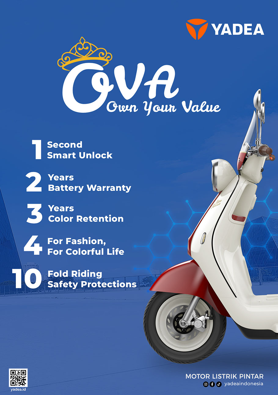 Menariknya, setiap angka pada nama OVA memiliki makna yang mencerminkan nilai fungsional dan emosional bagi penggunanya. Angka 1 melambangkan 1 Second Smart Unlock, fitur yang memungkinkan motor terbuka dalam satu detik melalui aplikasi Yadea, memberi kemudahan bagi gaya hidup dinamis. Angka 2 berarti garansi baterai selama dua tahun dengan jarak tempuh hingga 60 kilometer, menghadirkan rasa tenang dalam setiap perjalanan. Angka 3 mengacu pada ketahanan warna selama tiga tahun berkat teknologi cat tiga lapis yang menjaga kilau bodi tetap segar.