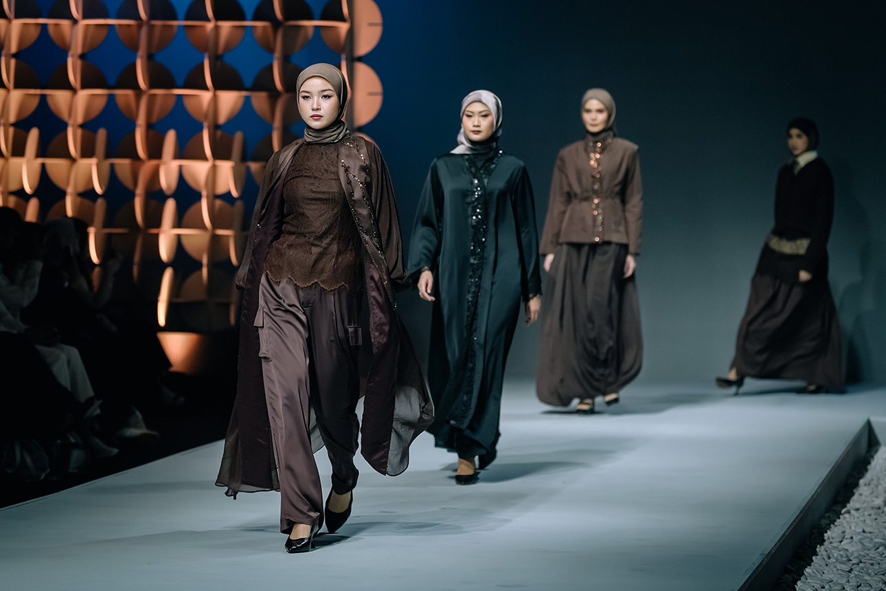 Silhouette yang tegas namun lembut menjadi ciri khas koleksi ini. Cutting bersih dengan garis arsitektural berpadu dengan bentuk longgar khas modest wear, menghadirkan tampilan yang feminin dan modern dalam satu kesatuan yang harmonis. Kudung menempatkan keseimbangan sebagai inti desainnya.