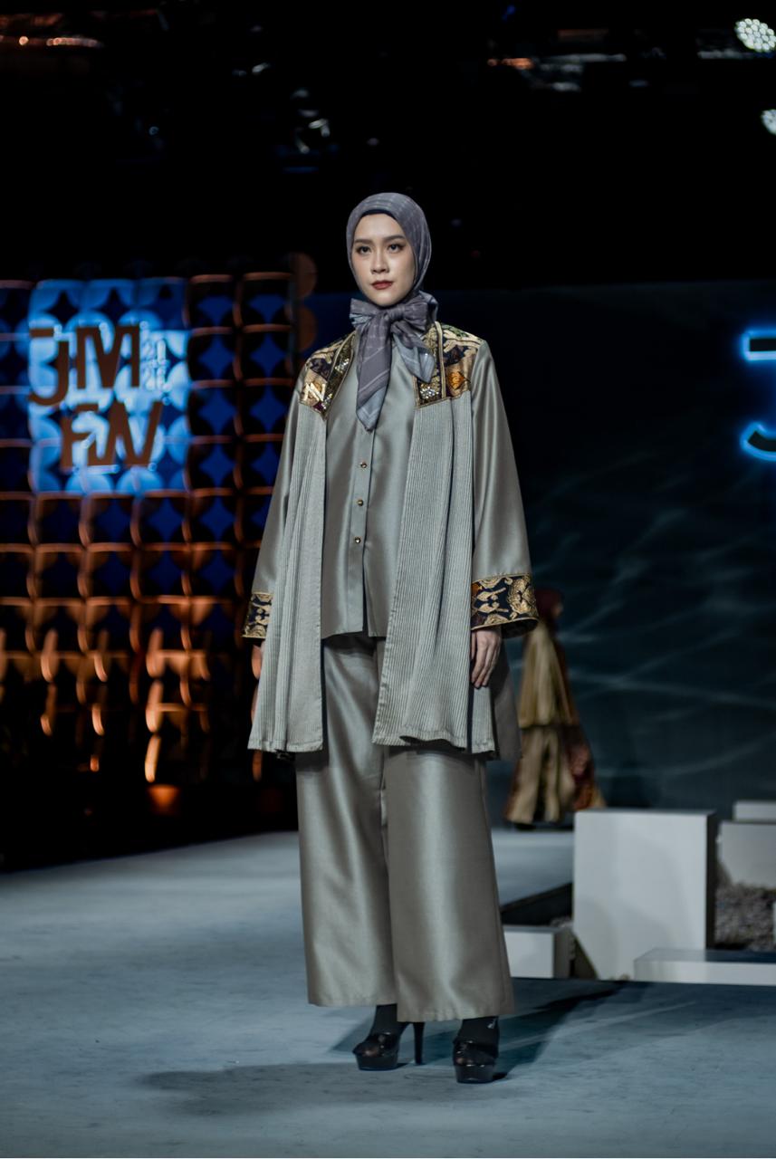 Sebagaimana koleksi sebelumnya, Calyara tetap menonjolkan silhouette A-line yang menjadi identitas brand Nina Nugroho. Detail piping yang memberi garis tegas, double manset (wudhu friendly) yang fungsional, serta struktur blazer dan long outer yang tegas. Menonjolkan karakter perempuan profesional: percaya diri, berwibawa, dan berkarakter kuat tanpa kehilangan sisi lembutnya. Busana ini tidak sekadar fashion statement, tetapi juga perwujudan nilai-bahwa perempuan dapat tampil sopan, elegan, dan berdaya di berbagai ruang kehidupan. (ES | Foto: Dok. Nina Nugroho)