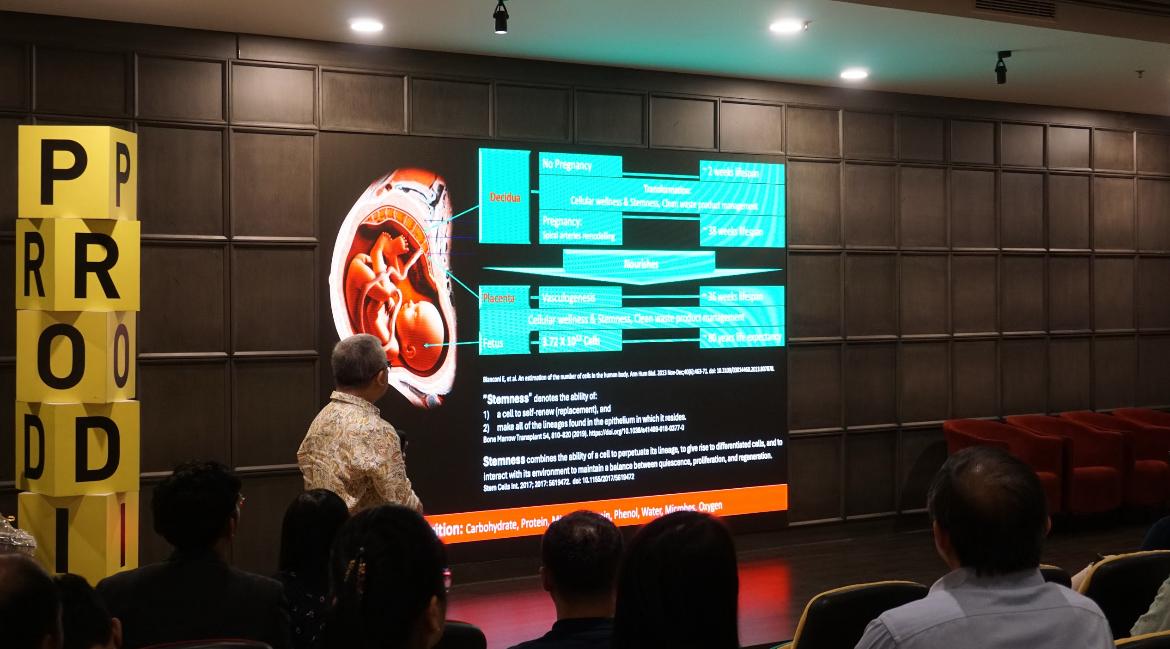 Salah satu praktisi kedokteran yang juga mendukung peluncuran Prodia, Prof. Dr. dr. Noroyondo Wibowo, Sp.OG, Subsp.KFM, menyampaikan bahwa informasi yang diperoleh dari teknologi ini dapat membantu memahami fisiologi hingga tingkat selular melalui parameter-parameter metabolomik. "Dalam hal ini, teknologi berbasis mass spectrometry memiliki kemampuan untuk mengidentifikasi zat yang dibutuhkan tubuh, mulai dari pra zat aktif, zat aktif, hingga proses metabolisme atau inaktivasi yang mencerminkan episode yang terjadi di dalam sel. Dengan dukungan teknologi cellular dissection, pemeriksaan dapat dilakukan hingga pada tingkat dinding sel, sitoplasma, dan organel-organel sel lain untuk menilai kondisi serta kecukupan nutrisi. Pendekatan ini diharapkan mampu menentukan parameter cellular wellness dan cellular stemness pada tiap organ serta mengorelasikannya dengan kadar di perifer," ujarnya. (ES | Foto: Dok. Prodia)