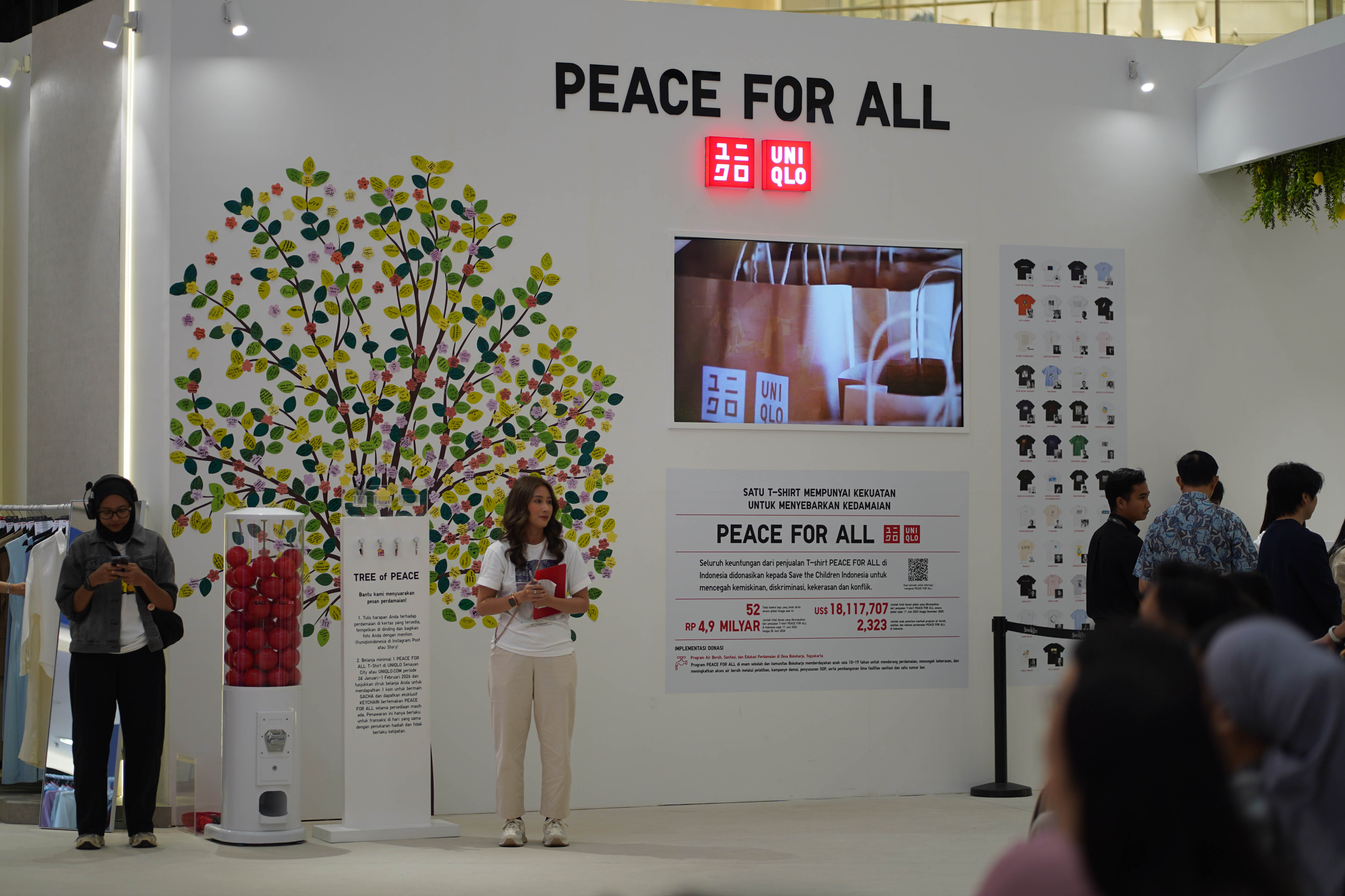 Sebagai bagian dari inisiatif UNIQLO PEACE FOR ALL, instalasi Tree of Peace mengajak pengunjung menuliskan pesan perdamaian dan harapan akan kesejahteraan manusia. Hingga Desember 2025, program ini telah melibatkan 48 kontributor desain, menjual lebih dari 9,61 juta T-shirt, dan mengumpulkan donasi lebih dari 18 juta dolar AS untuk berbagai program sosial, termasuk akses air bersih dan edukasi perdamaian di Indonesia.(UNIQLO Indonesia)